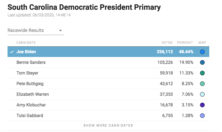 In hindsight the Democrat Centre’s strategy seems obvious – field a handful of candidates with very-slightly-different USPs, and see which one sticks best. Once that’s determined, close ranks and keep out the Left. Pete Buttigeig struggled hard for the illustrious title as Centre Favourite in Iowa and New Hampshire; but it was Biden’s confident South Carolina win that pushed him over the line.